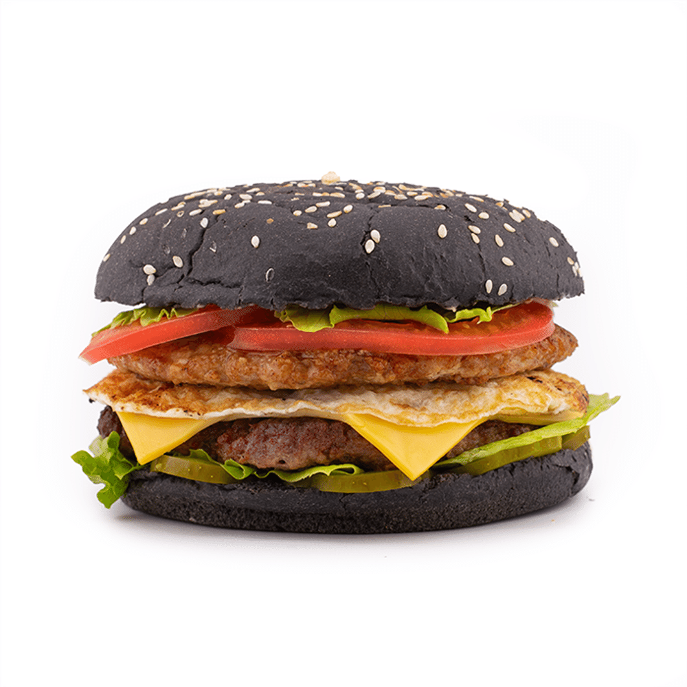 Сытный бургер с двумя сочными котлетками из говядины и цыпленка, нежным сыром Чеддер,овощами, луковыми кольцами, на фирменной черной булочке заправленный гармонично сочетающимися между собой соусами.