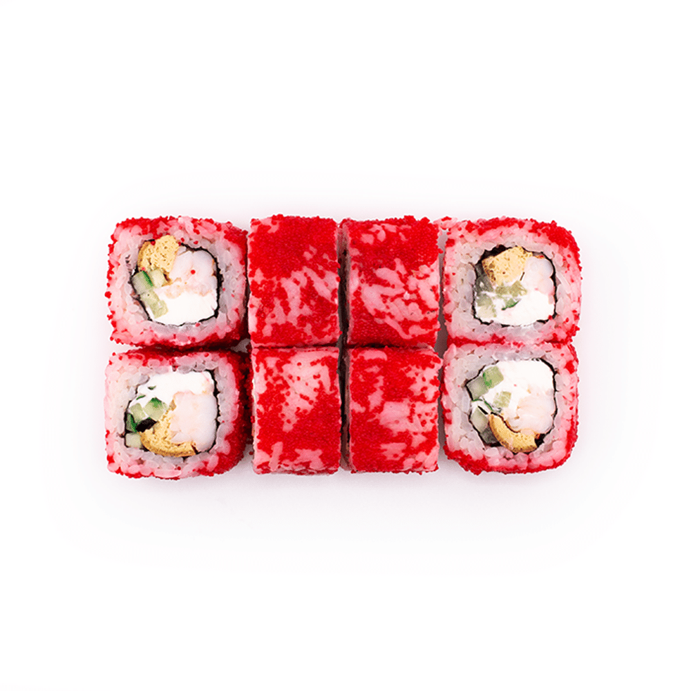 Фирменные роллы Состав: - Рис - Нори - Креветка тигровая - Огурец - Сыр сливочный - Тобика