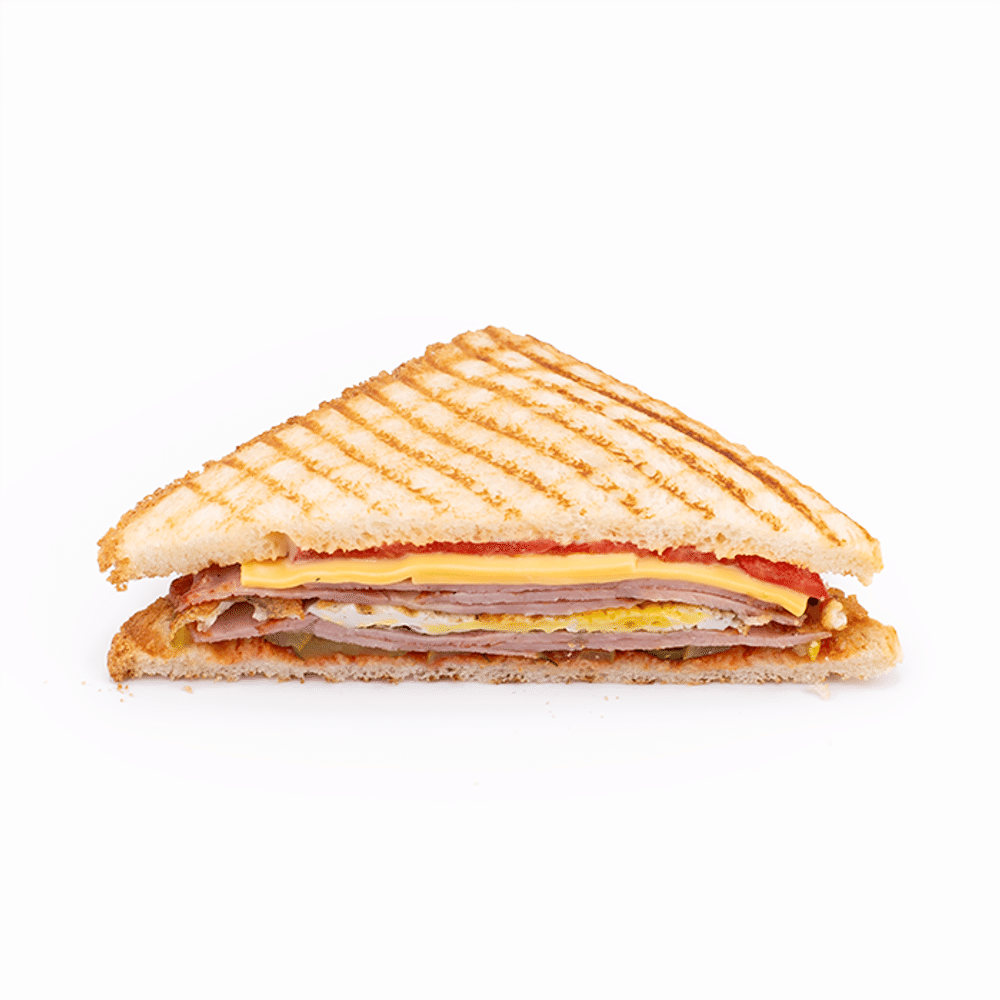Завтрак - это главное блюдо дня. Поджаренный на гриле тост, со сливочным сыром Чеддер, маринованными огурчиками, жареным яйцом, ломтиками ветчины обжаренной на гриле. Сытость на весь день.