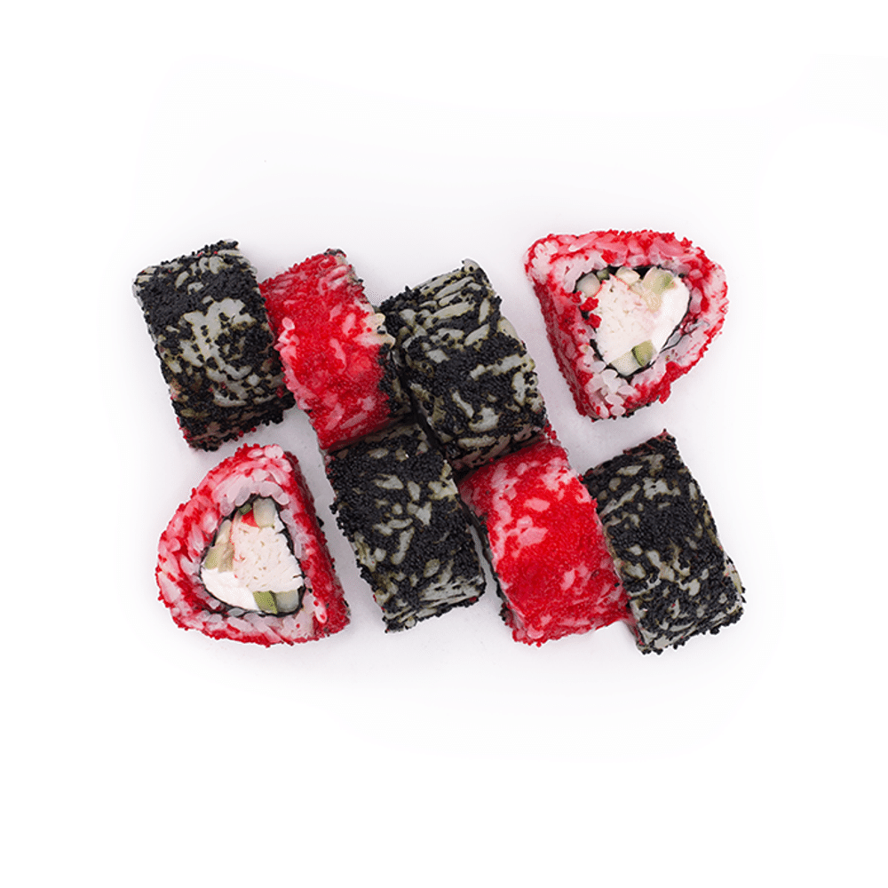 Фирменные роллы Состав: - Рис - Нори - Крабовое мясо - Огурец - Сыр сливочный - Тобика