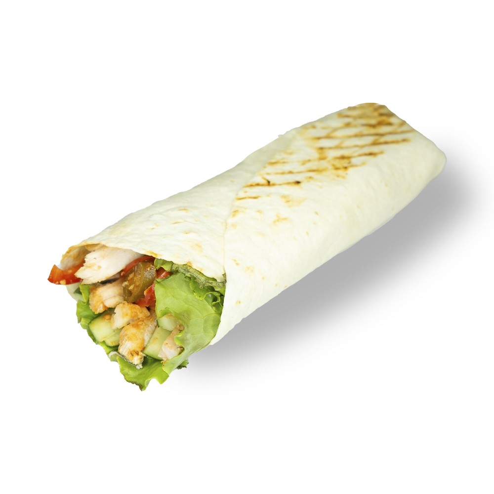 Острый мексиканский буррито в традиционной тортилье с филе цыпленка-гриль, нежным сыром, свежими овощами, кукурузой, фасолью, фирменным соусом и острым перцем халапеньо.