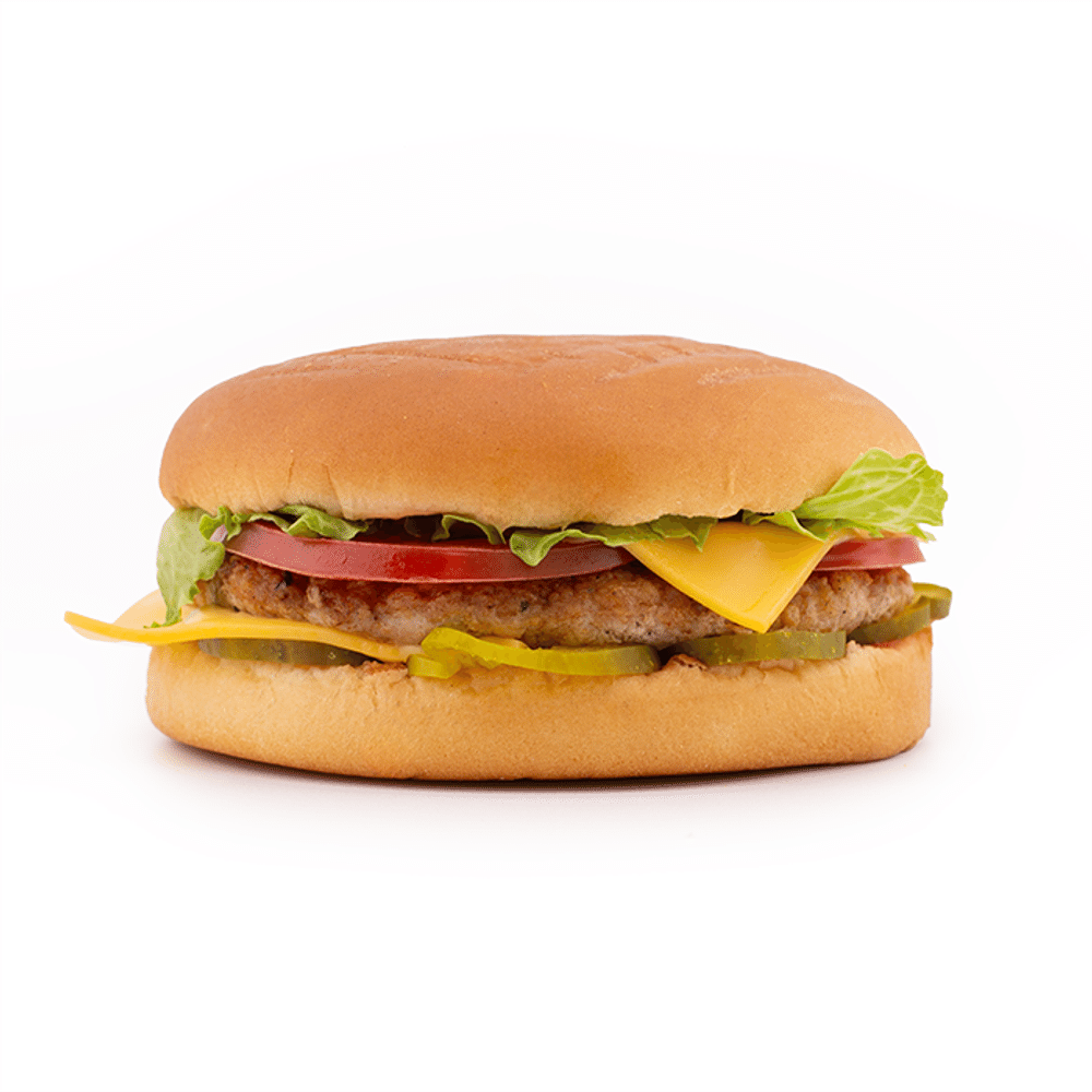 Сочная куриная котлета в хрустящей панировке,сыр Чеддер, свежие овощи, на белой булочке, заправленный фирменными соусами.