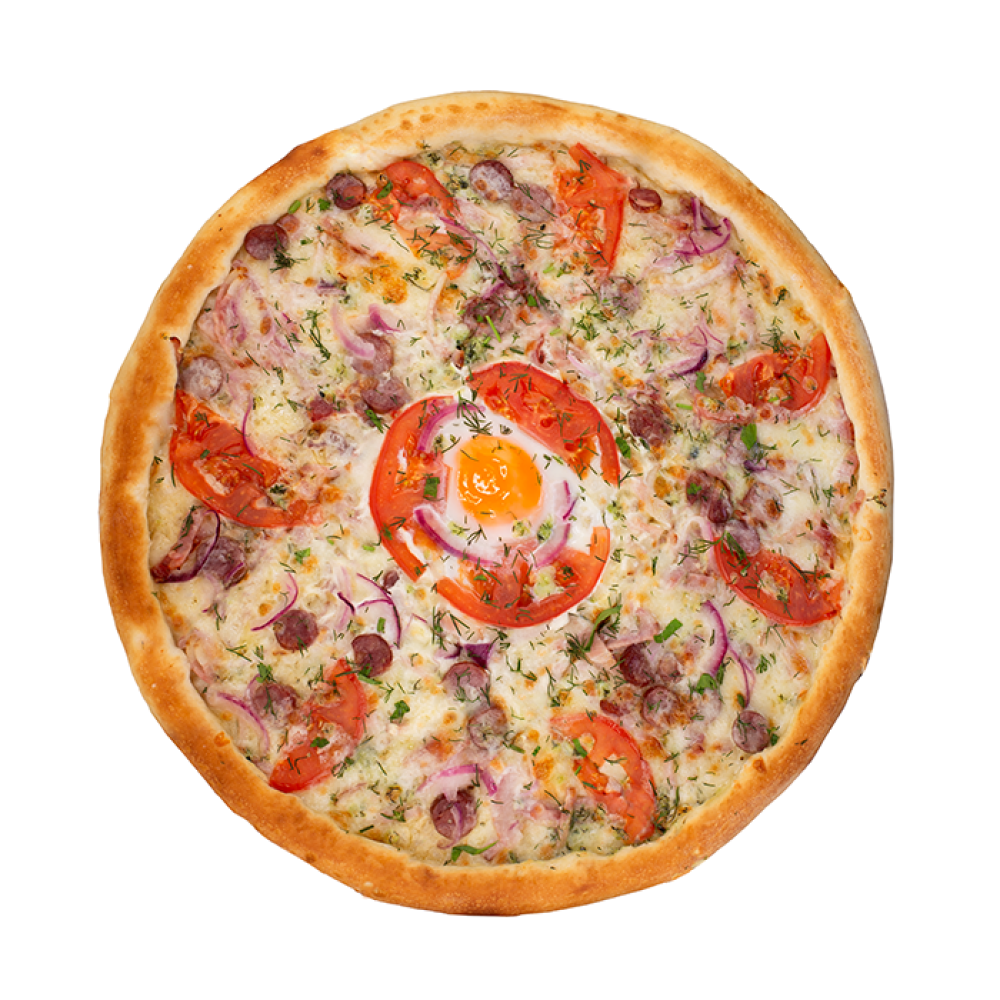 Для любителей корочек .Классическая пицца с нежнейщим беконом,свежими помидорами, копчеными колбасками, под сливочным сыром Моцарелла . Фишкой нашей пиццы является запеченое яйцо, в которое можно мокать хрустящими корочками.