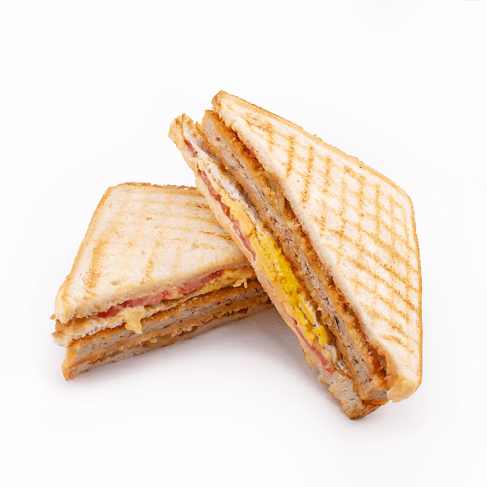 Завтрак - это главное блюдо дня. Поджаренный на гриле тост, со сливочным сыром Чеддер, маринованными огурчиками, жареным яйцом, куриной котлеткой обжаренной на гриле. Сытость на весь день.