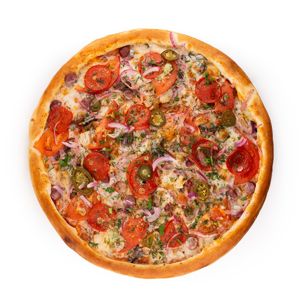 Ароматный бекон, ветчина, филе цыпленка, с нежной мацареллой на тонком тесте, копченые колбаски, с пикантной начинкой.