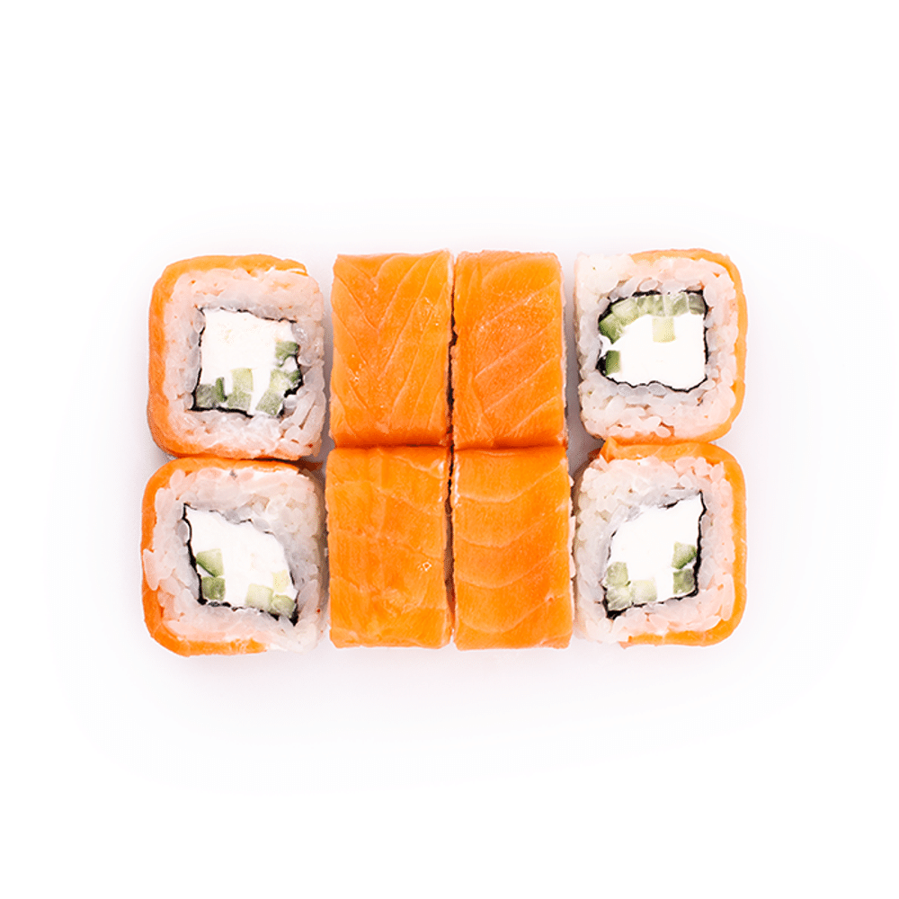 Фирменные роллы. Состав: - Рис - Нори - Лосось - Сыр сливочный - Огурец