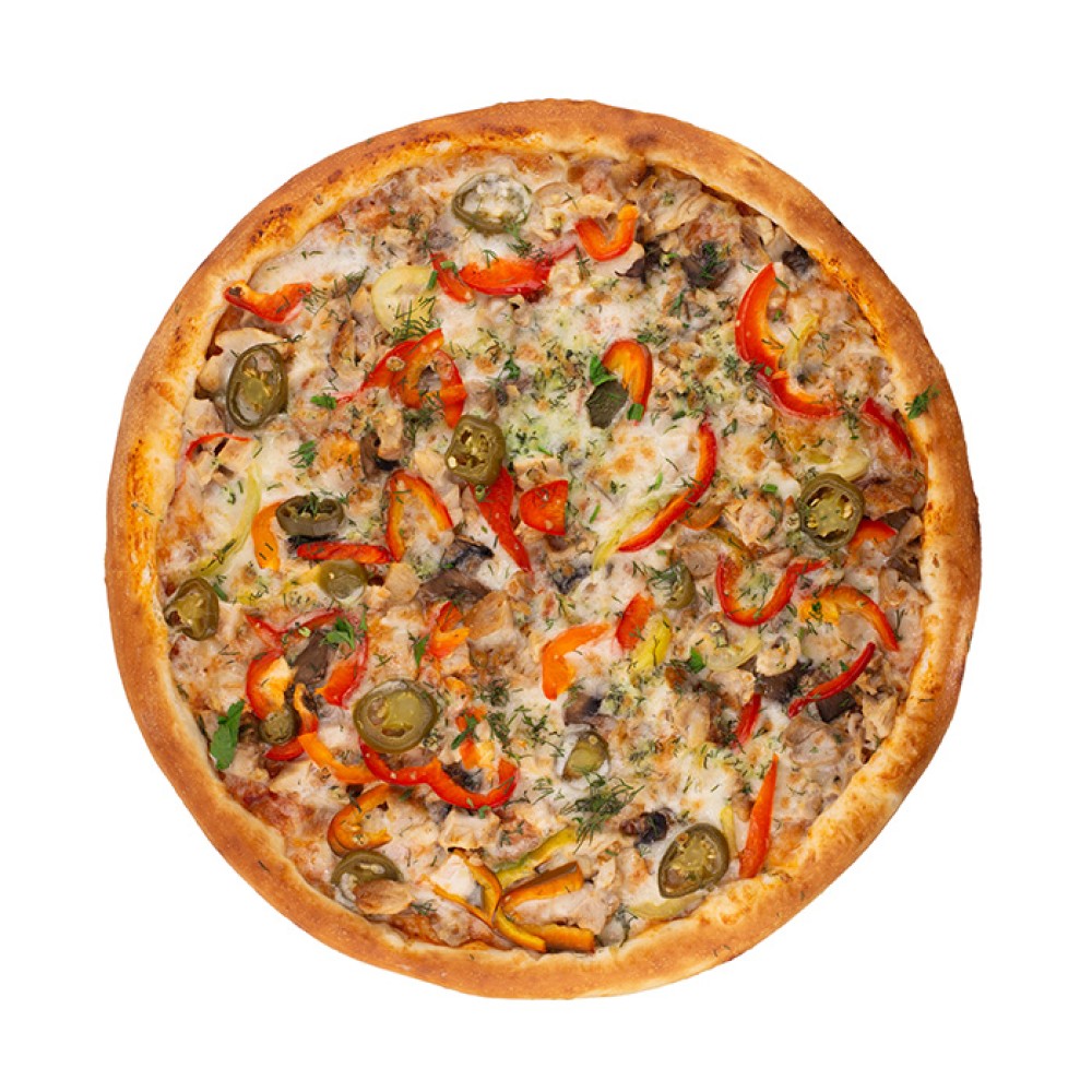 Жгучая мексиканская пицца с острым цыпленком , томатами, перцем халапеньо и сыром "Моцарелла".