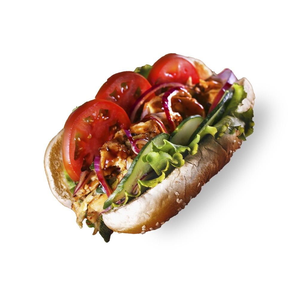 Больше мяса, больше соуса, больше овощей. Рубленый хот-дог это кусочки курочки гриль, помидорчики, огурчики, лучок, комбо кетчупа и горчицы, со свежим листом салата.