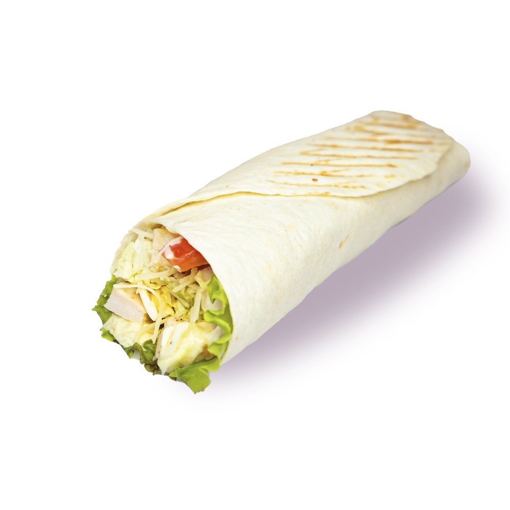 Курочка, свежие овощи, хрустящий салат, соус цезарь и ароматный пармезан, все в пшеничной тортилье, слегка поджаренной на гриле.