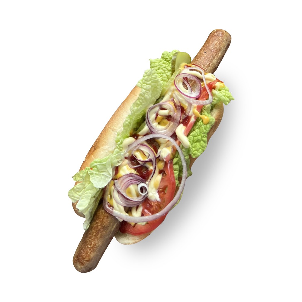 Классика фастфуда. Пшеничная булочка, колбаска, приправленная кетчупом, майонезом и горчицей, с добавлением свежих овощей.