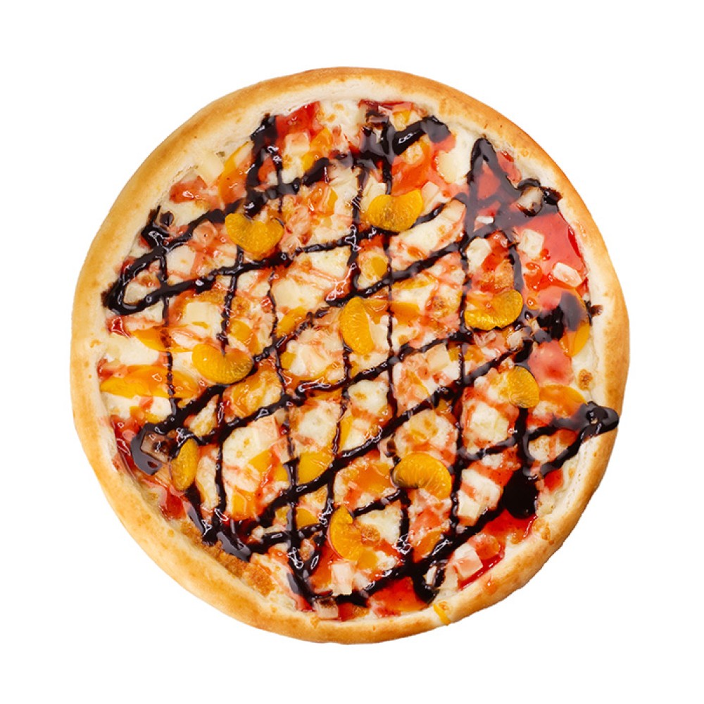 Сладкая десертная пицца в сотаве которой ананас, персик, мандарин, сыр и всё это дополняет нежный сливочный и шоколадный соус.
