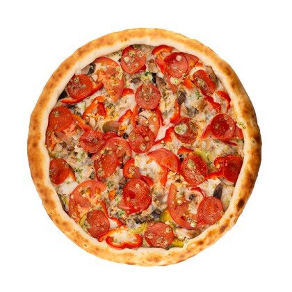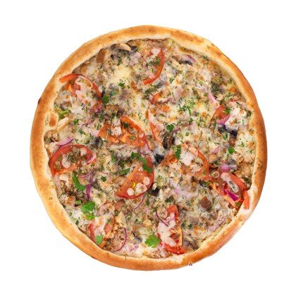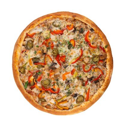 пикантная пицца для любителей экзотики и не обычных сочетаний. в состав входя нежное филе цыпленка, ананас, спелые томаты, сыр и нежный сливочный соус.