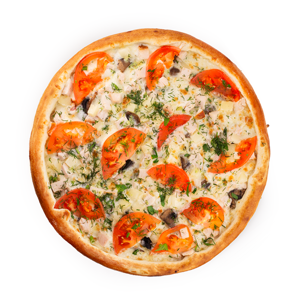 Пикантная пицца для любителей экзотики и необычных сочетаний. В состав входят филе цыпленка, ананас, спелые томаты, сыр и нежный сливочный соус.