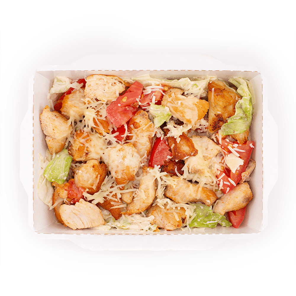 Салат с обжаренным куриным филе, ароматным пармезаном, помидоры черри, сухарики, лист салата и фирменный соус.