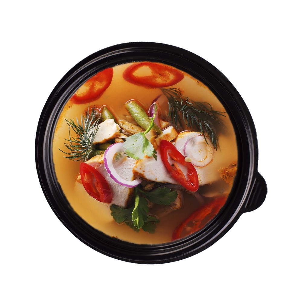 Классический тайский супчик с филе цыпленка, грибами и овощами в сочетании с бульоном на пряных травах, дает возможность прочувствовать все грани вкуса этого супчика.