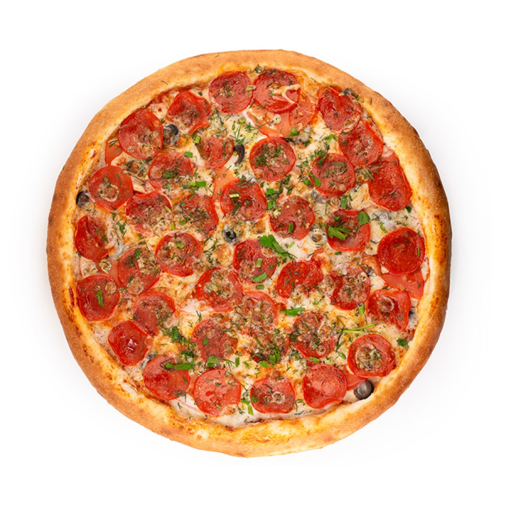 Пикантная пицца на красном фирменном соусе. Пряная сырокопченая колбаска с нежной моцарелой, перчиком халапеньо на тонком тесте.