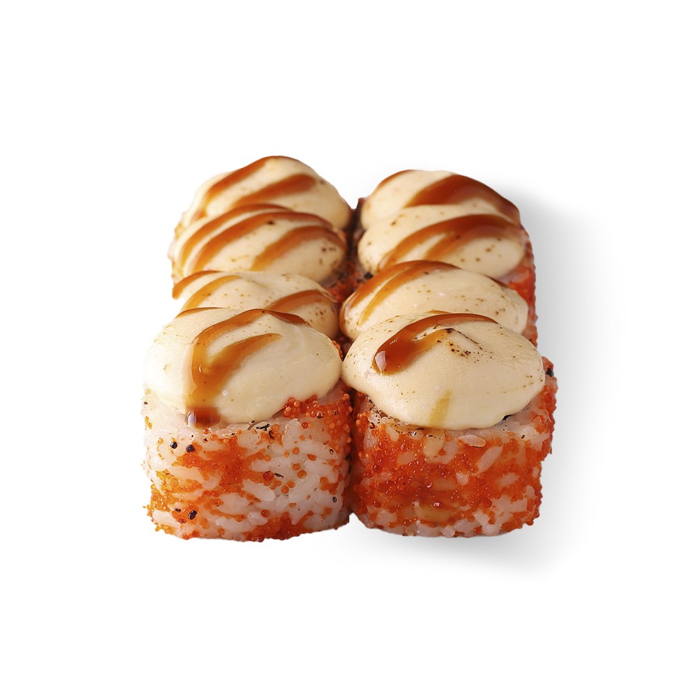 Запеченные роллы. Состав: - Рис - Нори - Тобика - Огурец - Креветка тигровая - Томаго - Соус шеф