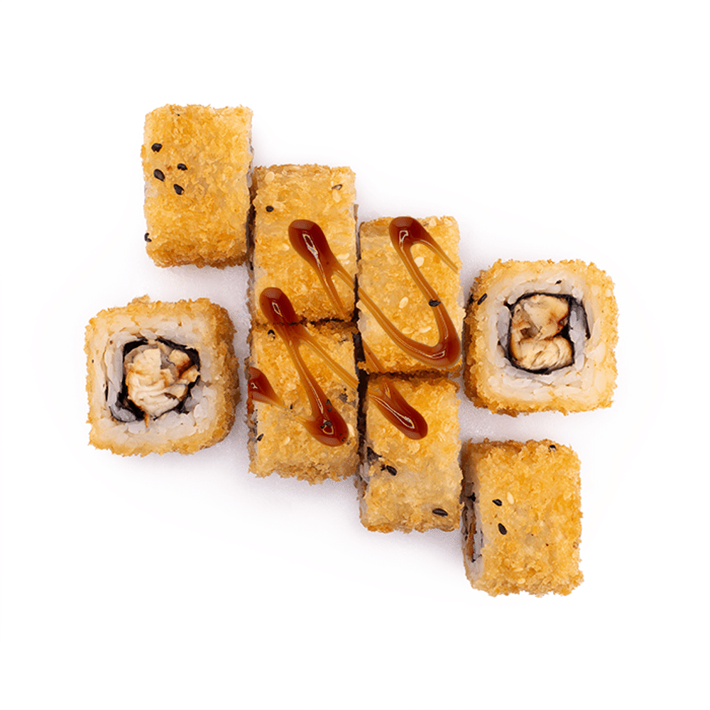 Роллы теплые классические. Состав: -Рис -Нори -Угорь -Панировка