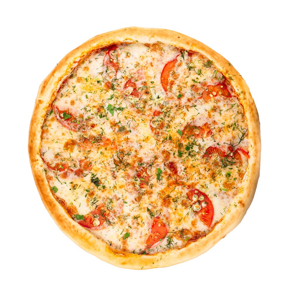 Традиционная пицца с сочными помидорами, мягкой тягучей моцареллой и свежей зеленью. Состав: -Сыр-"Моцарелла" -Помидоры -Зелень -Соус фирменный красный